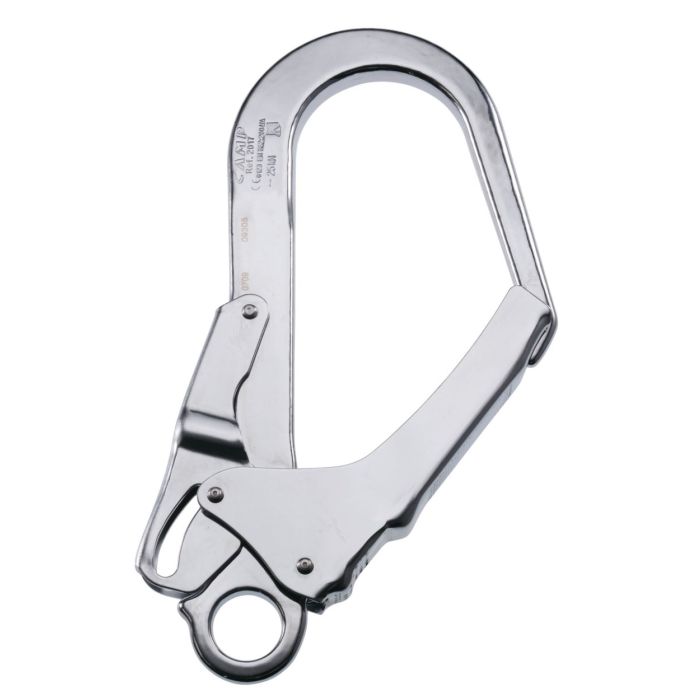 Le mousqueton Acier Big Hook 25KN est conçu avec un type de fermeture "Lever Lock" pour un verrouillage avec levier postérieur de sécurité.