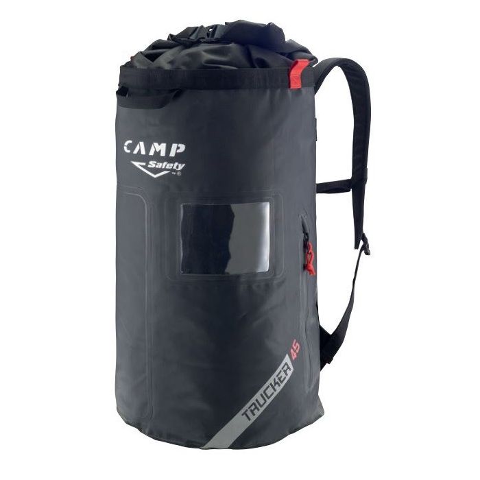 Dos et brettelles rembourrés. Fermeture à enroulement. Deux fermetures éclair latérales : l’une est une grande poche et l’autre permet d’accéder directement au bas du sac à dos. Porte-étiquette transparent. A l’intérieur, une poche zippée, des anneaux porte-matériel et boucles pour la corde.