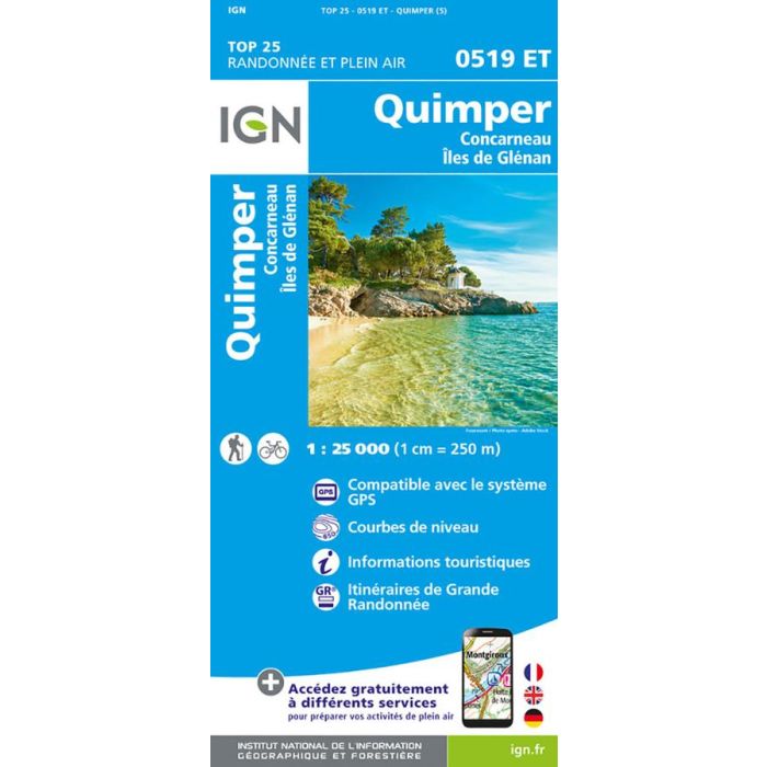 Cette carte IGN 0519ET -Quimper - Concarneau et île de Génan couvre les communes de Fouesnant, Concarneau, Quimper, trégunc, La Forêt-Fouesnant, Bénodet, Pleuven, elliant, Saint-Yvi, Gouesnach, Melgven, Ergué-Gabéric, Saint-Evarzec, Clohars-Fouesnant