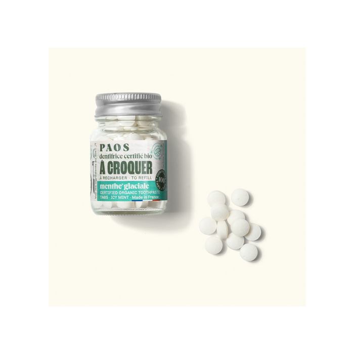 100 pastilles de dentifrice à croquer de la marque PAOS - Goût Menthe fraîche, menthe glaciale ou fraise (enfant)