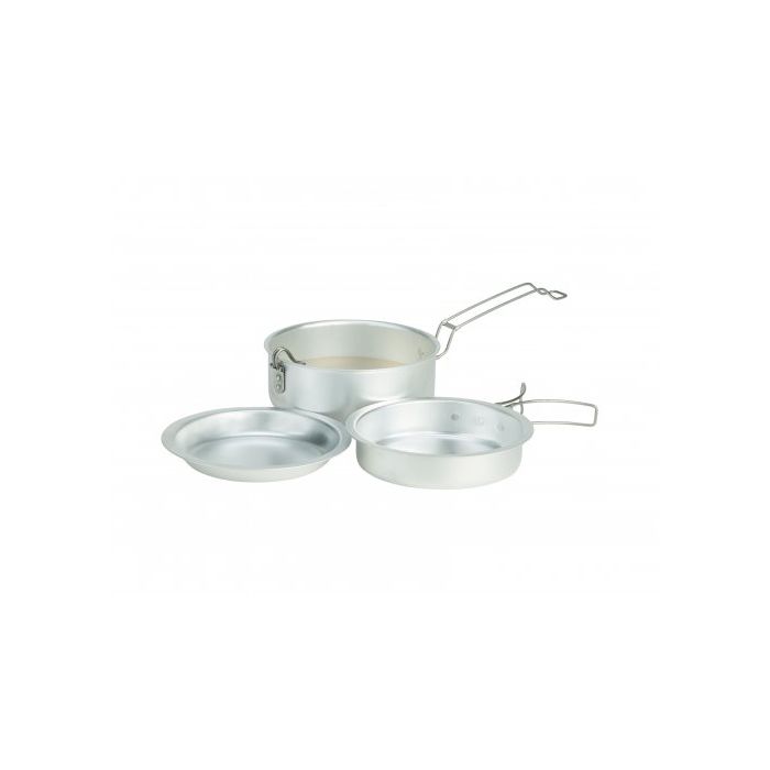 Elle comprend : 1 marmitte avec une poignée de fermeture, 1 poêle avec une poignée pliable et une assiette creuse en aluminium.