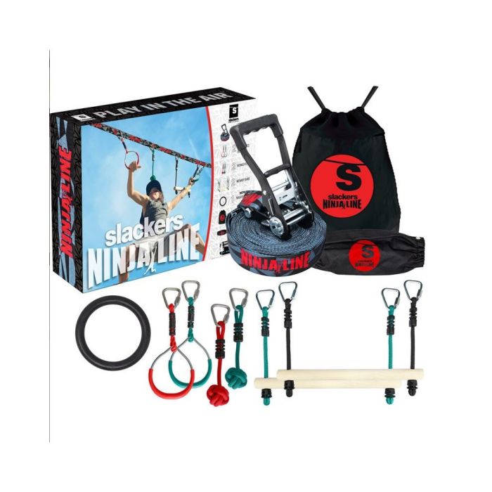 Le Kit comprend : - 1 Slackline de 9 m (+ 2 m de sangle avec Cliquet) - 3 Poings de singe (Nylon - 25 cm) - 2 Barre de singe en bosi de bouleau (40 cm) - 2 Anneaux de gymnastique en acier (avec texture aggripante) Livré dans un sac de transport ainsi que 9 mousquetons.